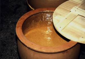 When cooled in the cooling pot, the juice thickens and becomes pasty. As it still contains much heat, it is moved into an unglazed pot called "Hiyashi-kame(cooling ceramic pot)" and left out for further cooling and crystalization. The above picture shows the juice being cooled in a "Hiyashi-kame".